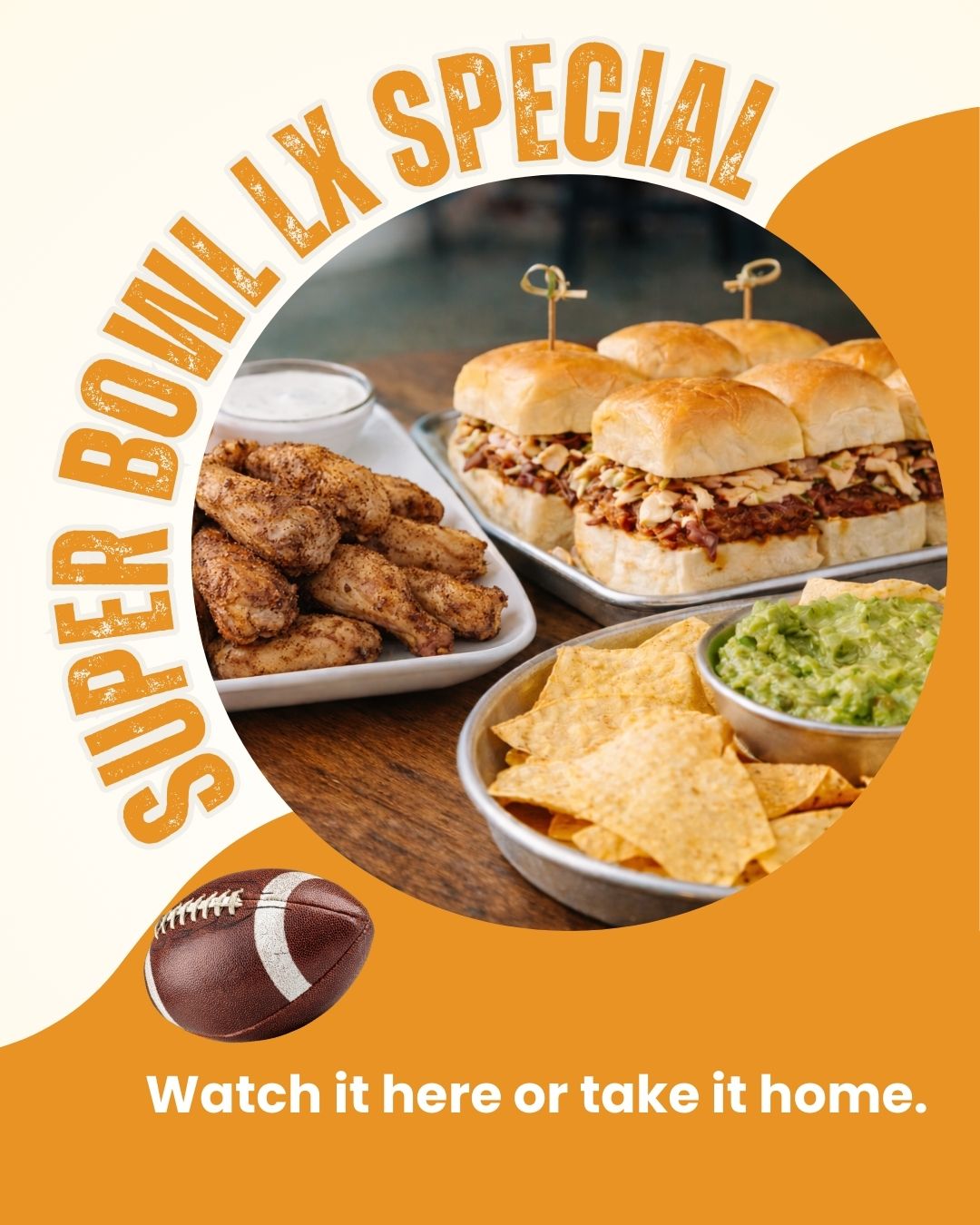 🍗 Super Bowl Party Meal only $49 feeds about 4 people. 20 bone-in dry rubbed chicken wings, 8 pulled pork sliders and chips & guacamole. Watching with a bigger crew? Double it.